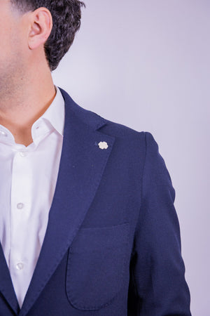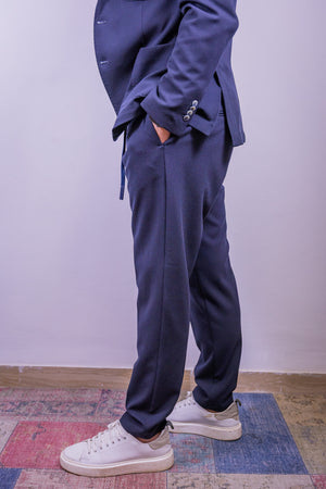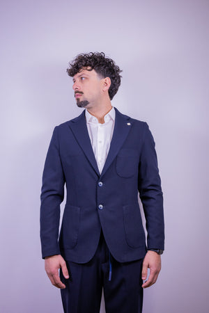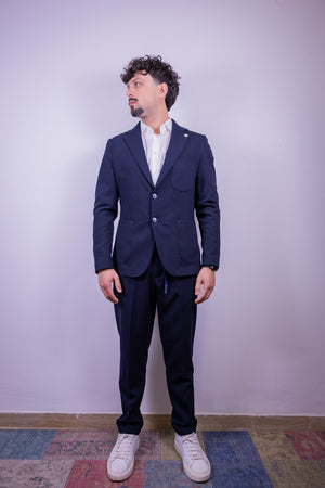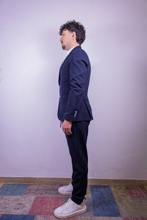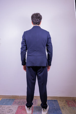 Abito monopetto color blu navy over-d composto da giacca con 2 bottoni tasca a toppa e doppio spacco sul retro. Pantamolla slim fit tasca america.