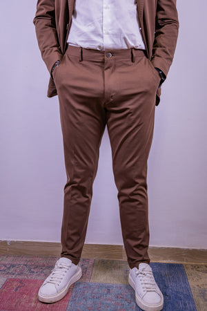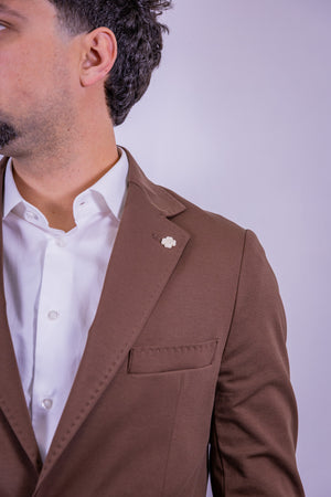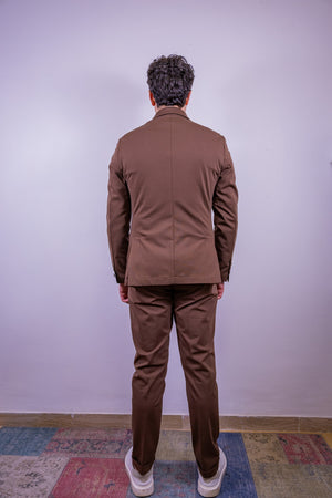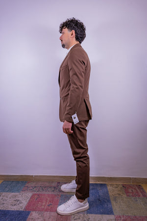 Abito in punto milano over-d color tabacco, composto da giacca 2 bottoni, tasche a toppa e 2 spacchi sul retro, pantalone slim fit con risvoltino cucito.