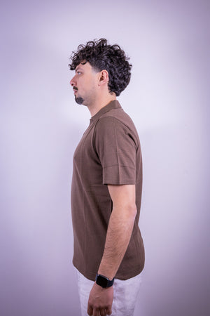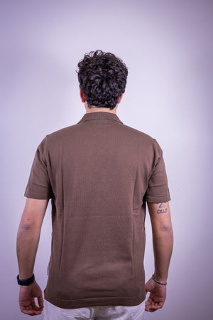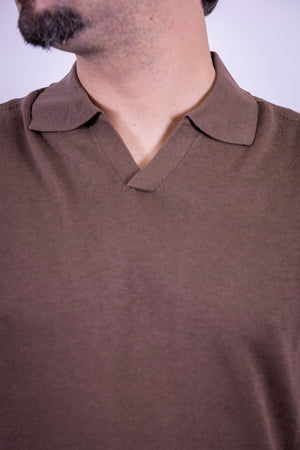 Polo derby Berna senza bottoni marrone con colletto Oxford, fondo dritto con bandierina logo applicata lateralmente e spacchi laterali.