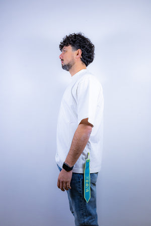 T-shirt boxy fit vintage berna color panna con fondo dritto, bandierina logo applicata lateralmente, orlo con con finitura a coste e pendaglio decorativo.