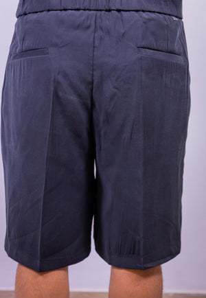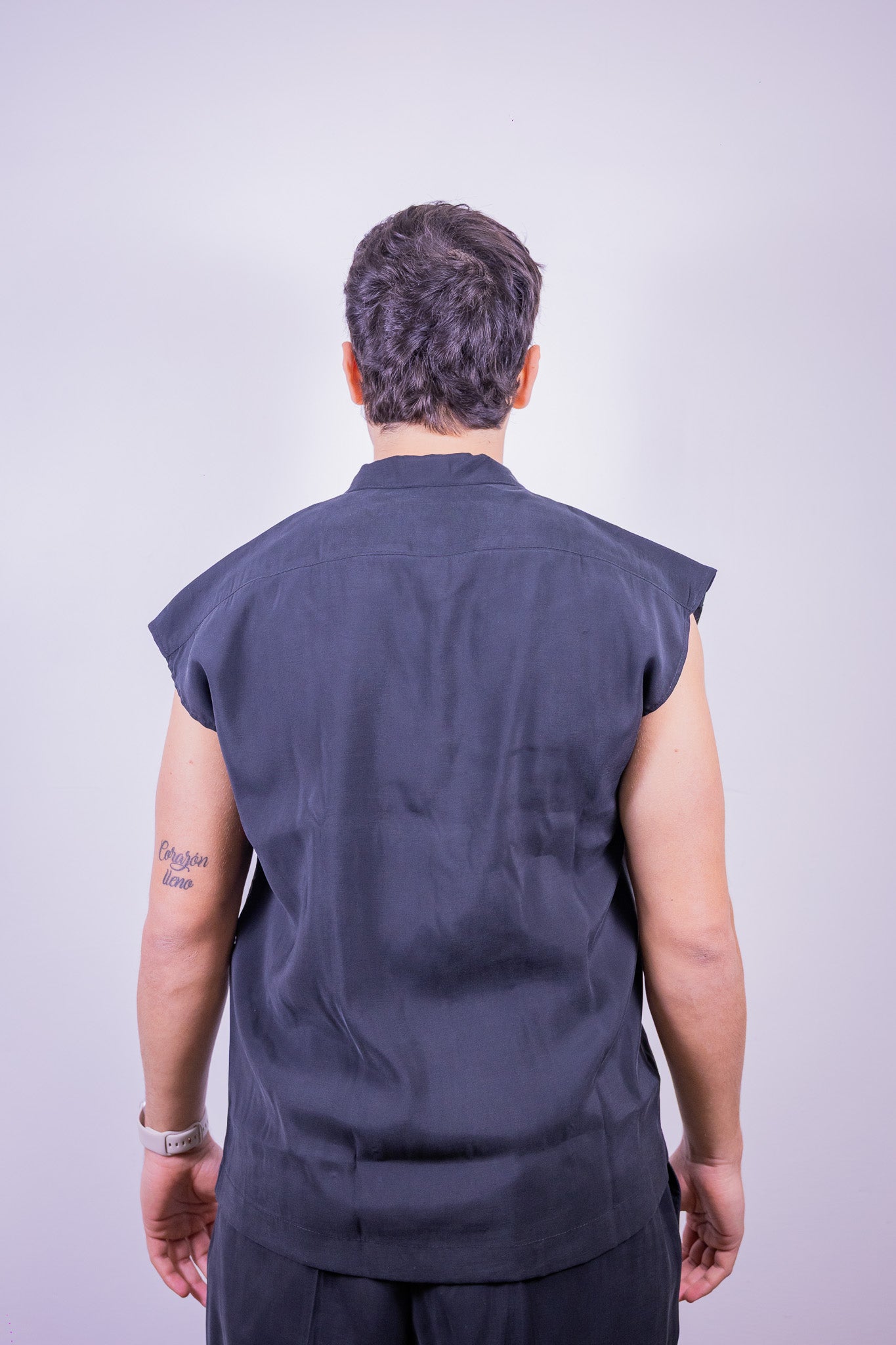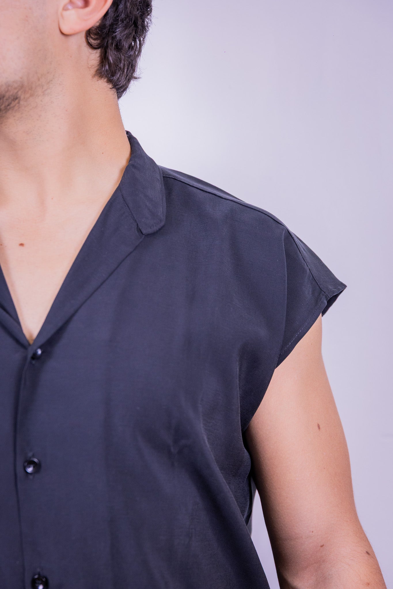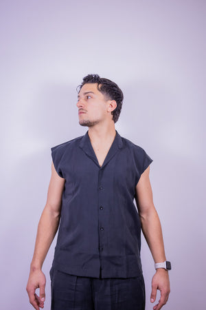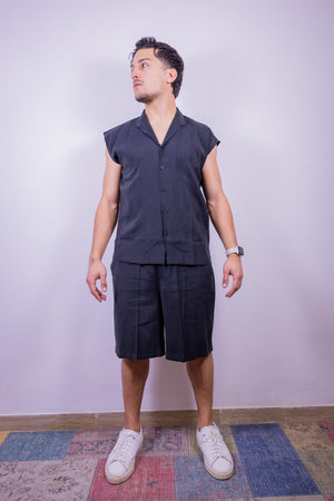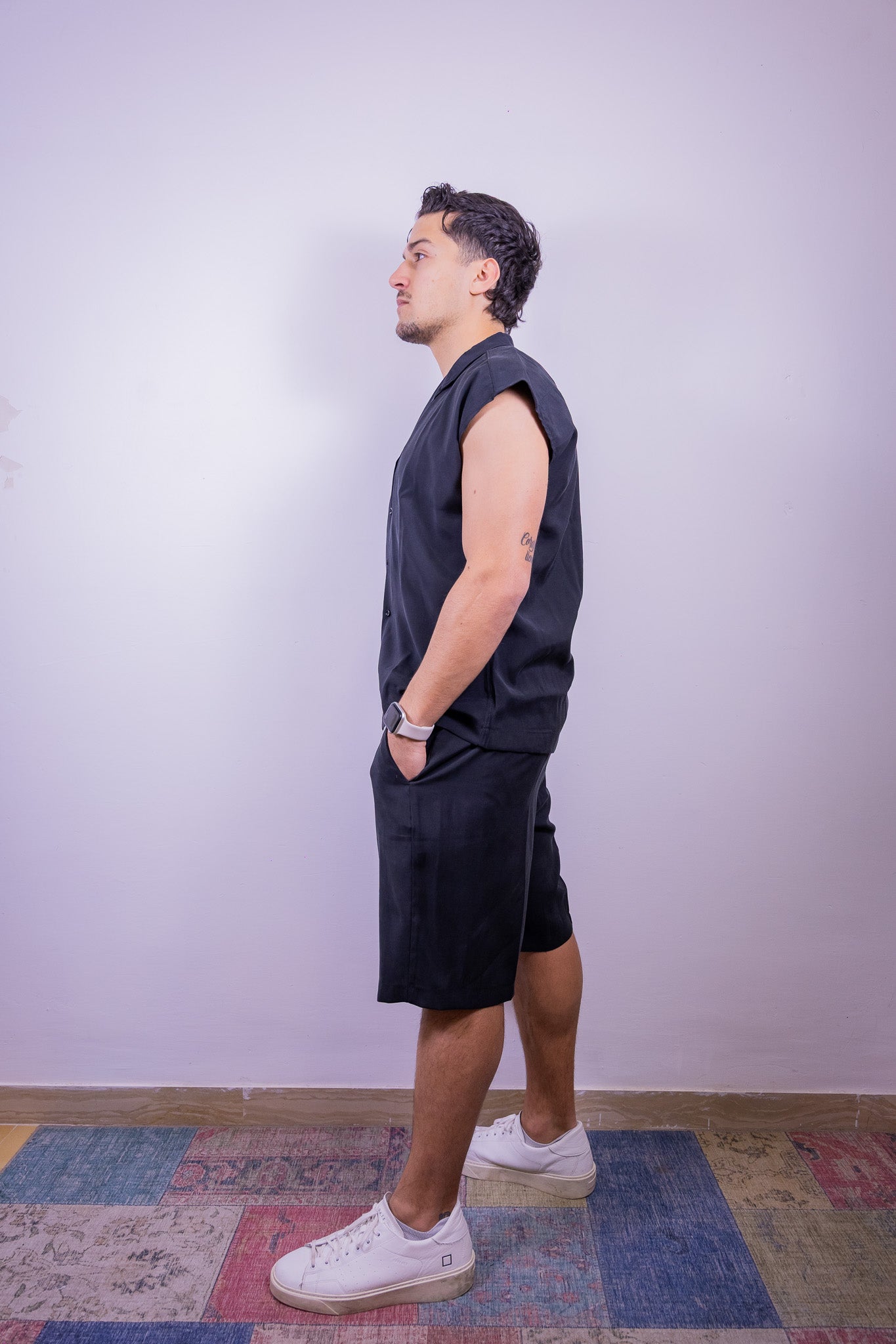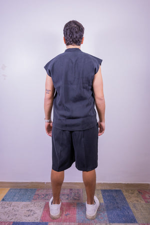 Coordinato blusa smanicato over-d nero composto da blusa smanicata con abbottonatura centrale e scollo a V e bermuda con elastico in vita dalla vestibilità comoda.