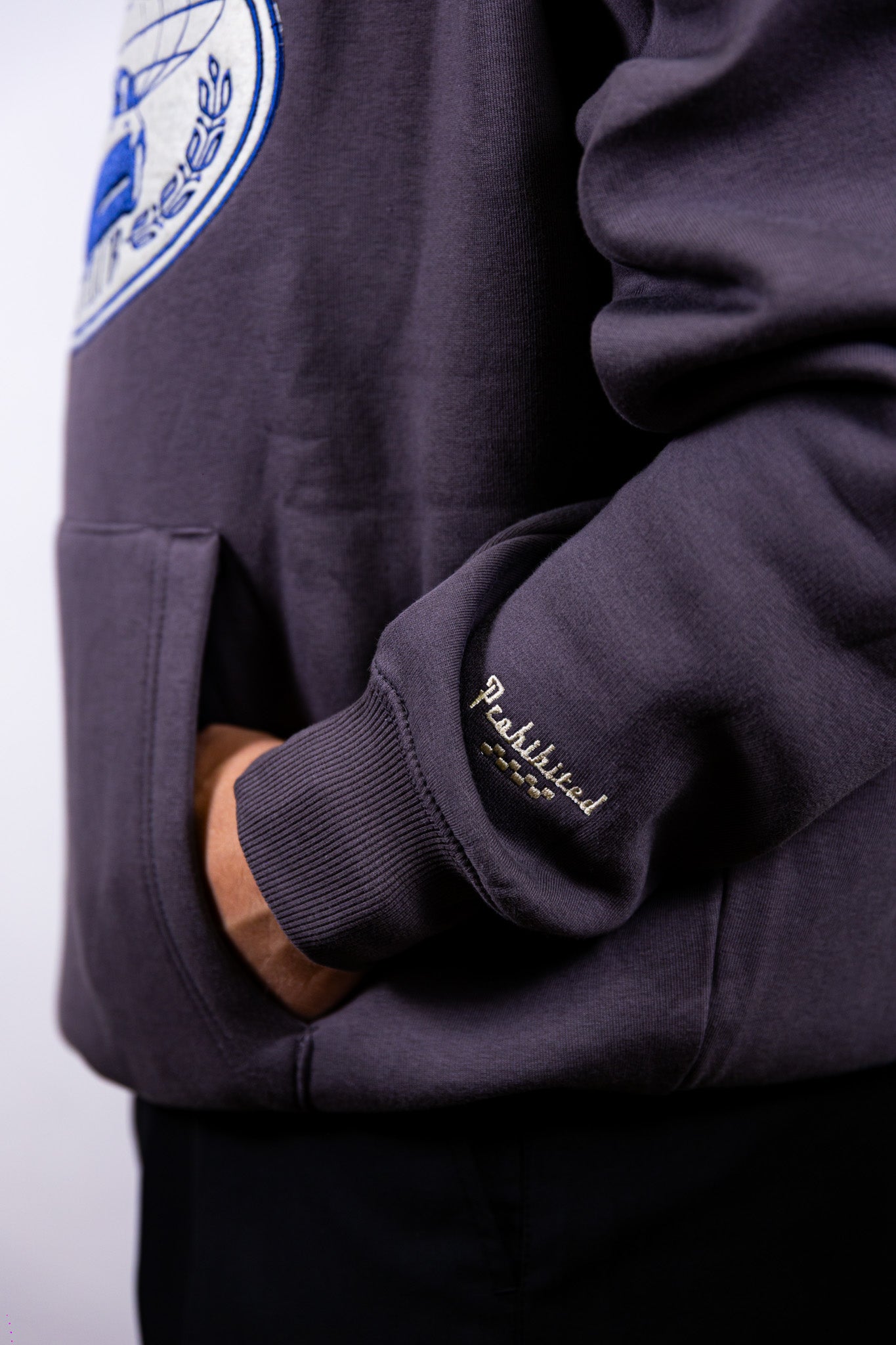 Felpa prohibited blu in cotone360 g/m² con patch logo davanti e ricamo logo sulla manica sinistra.