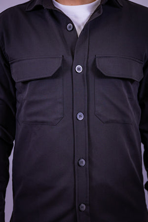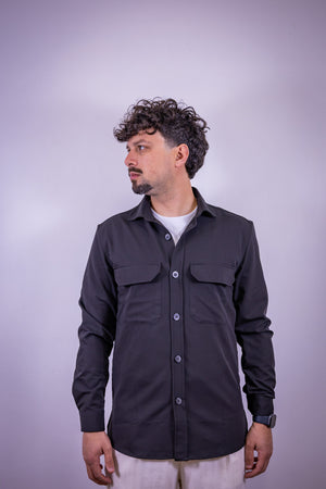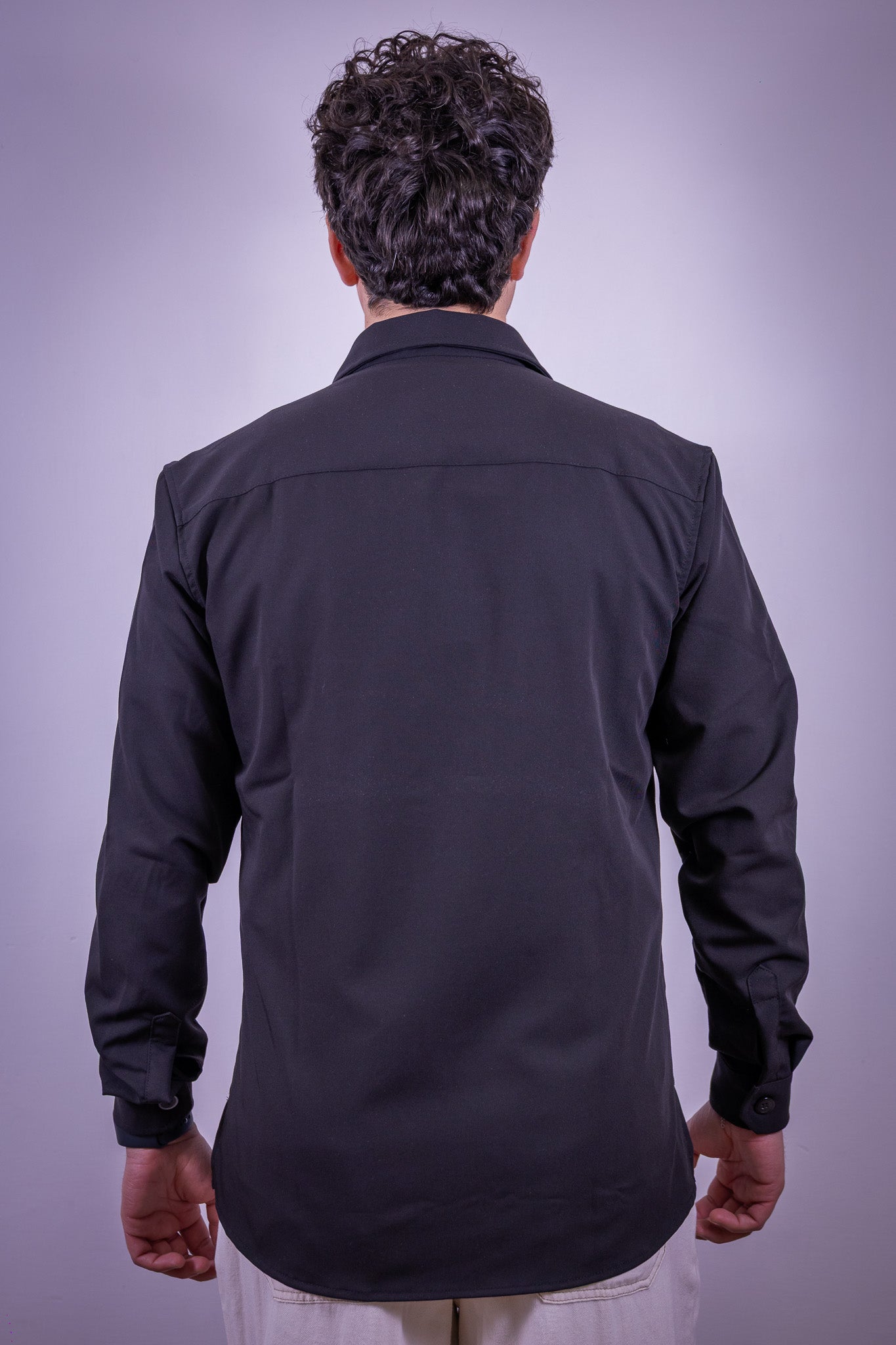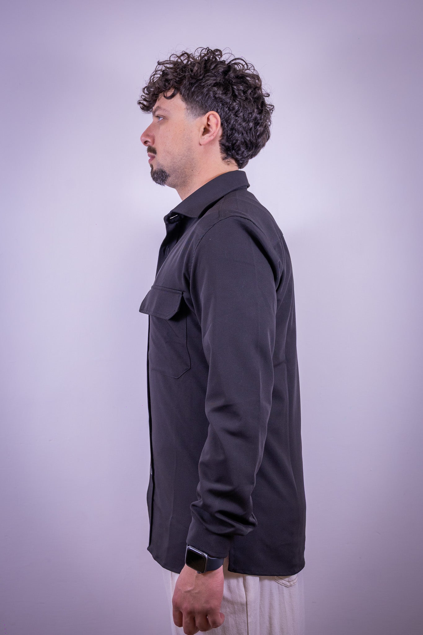 Overshirt over-d manica lunga colore nero con due tasconi alti, colletto e abbottonatura centrale con bottoni.