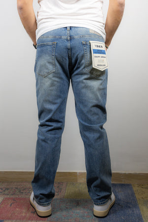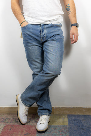 Jeans Denim 5 tasche regular fit berna lavaggio intermedio con tasche taglio americano sul fronte, chiusura centrale con bottoni, tasche sul retro con bandierina logo applicata.