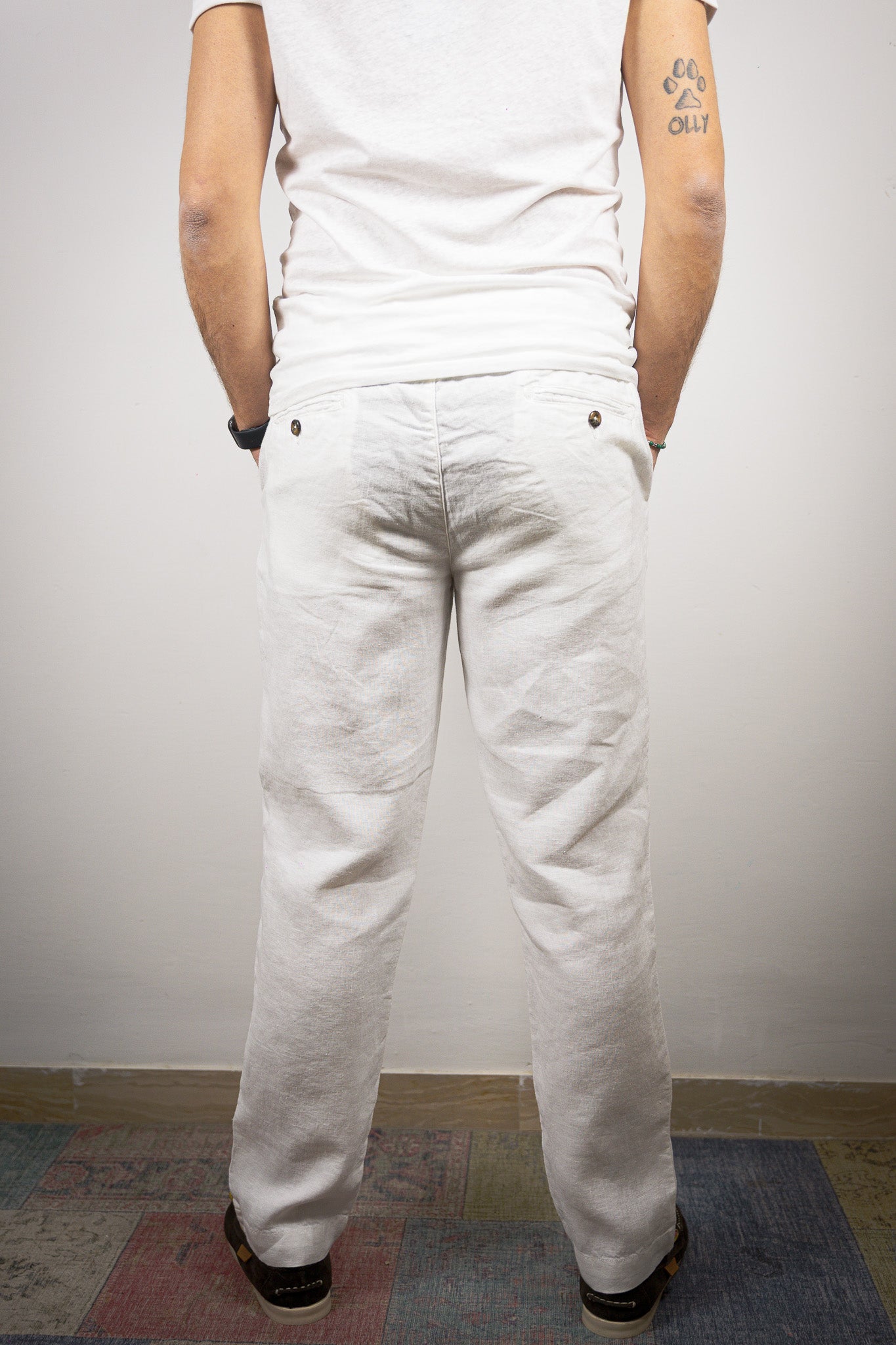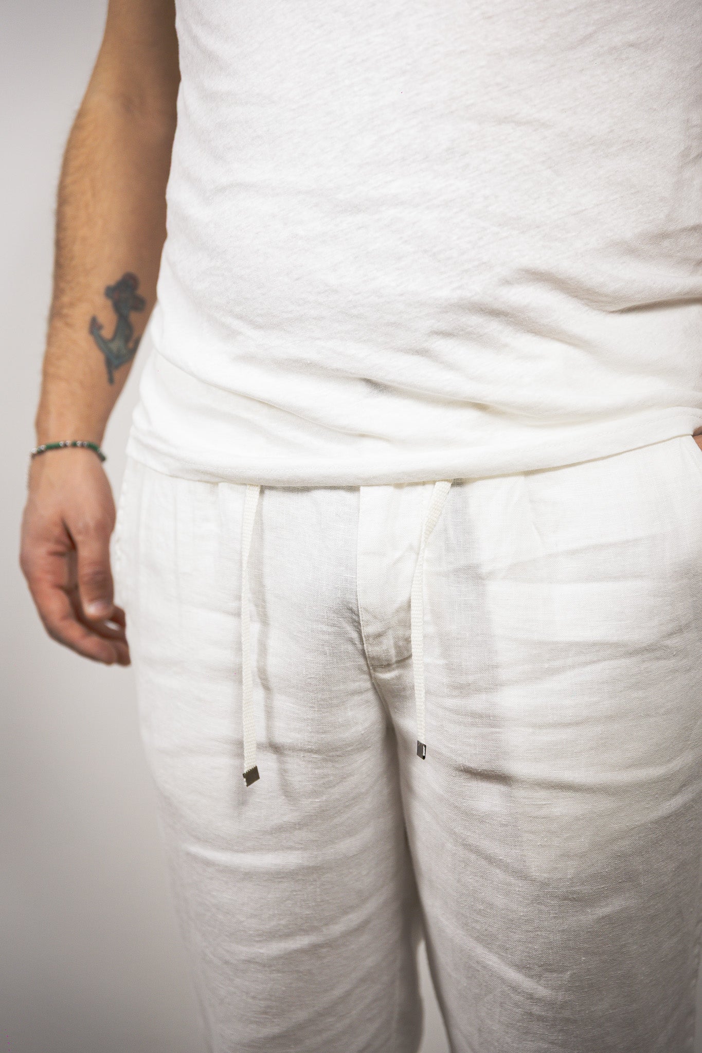 Pantalaccio bl11 color bianco interamente in lino con laccio tono su tono e tasche a filetto sul retro.