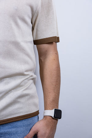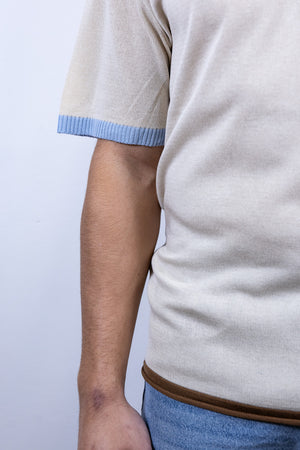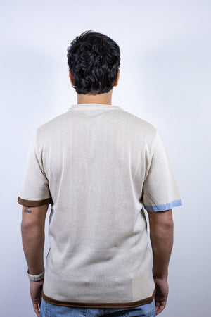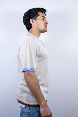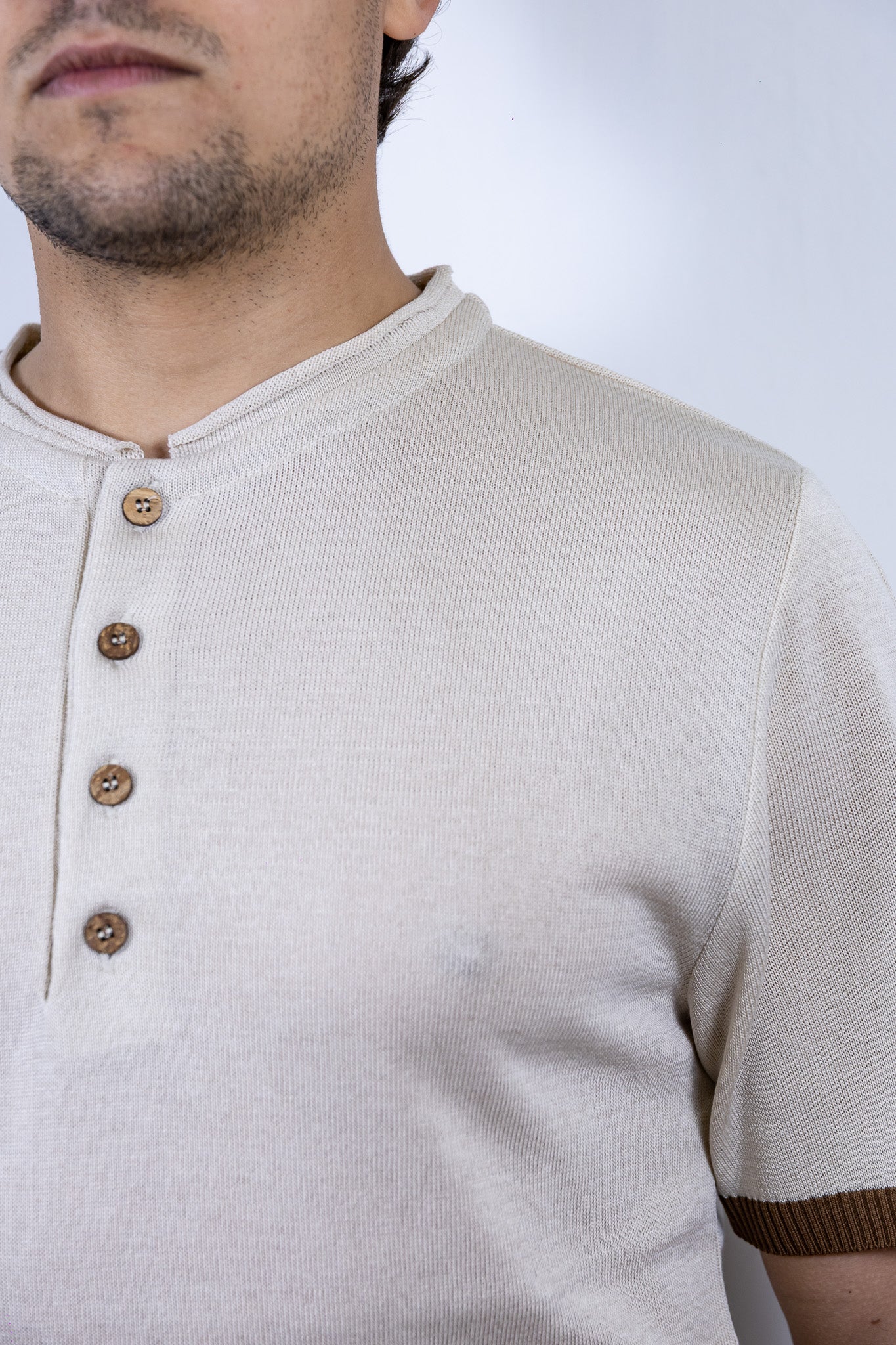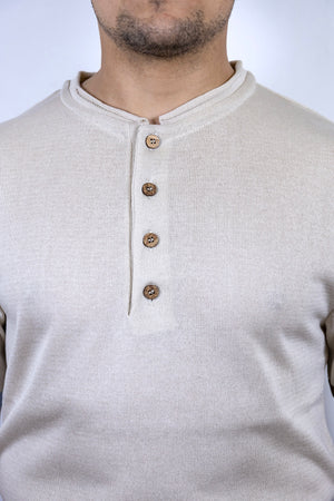 Maglia serafino beige over-d con bottoni in legno e dettaglio colorato sulle maniche e sul fondo.