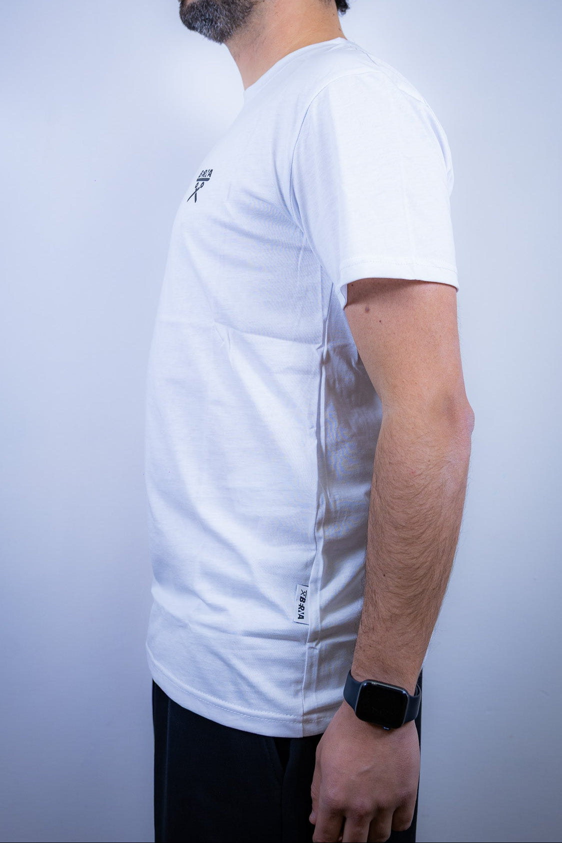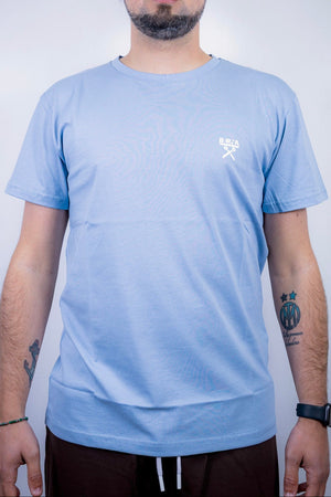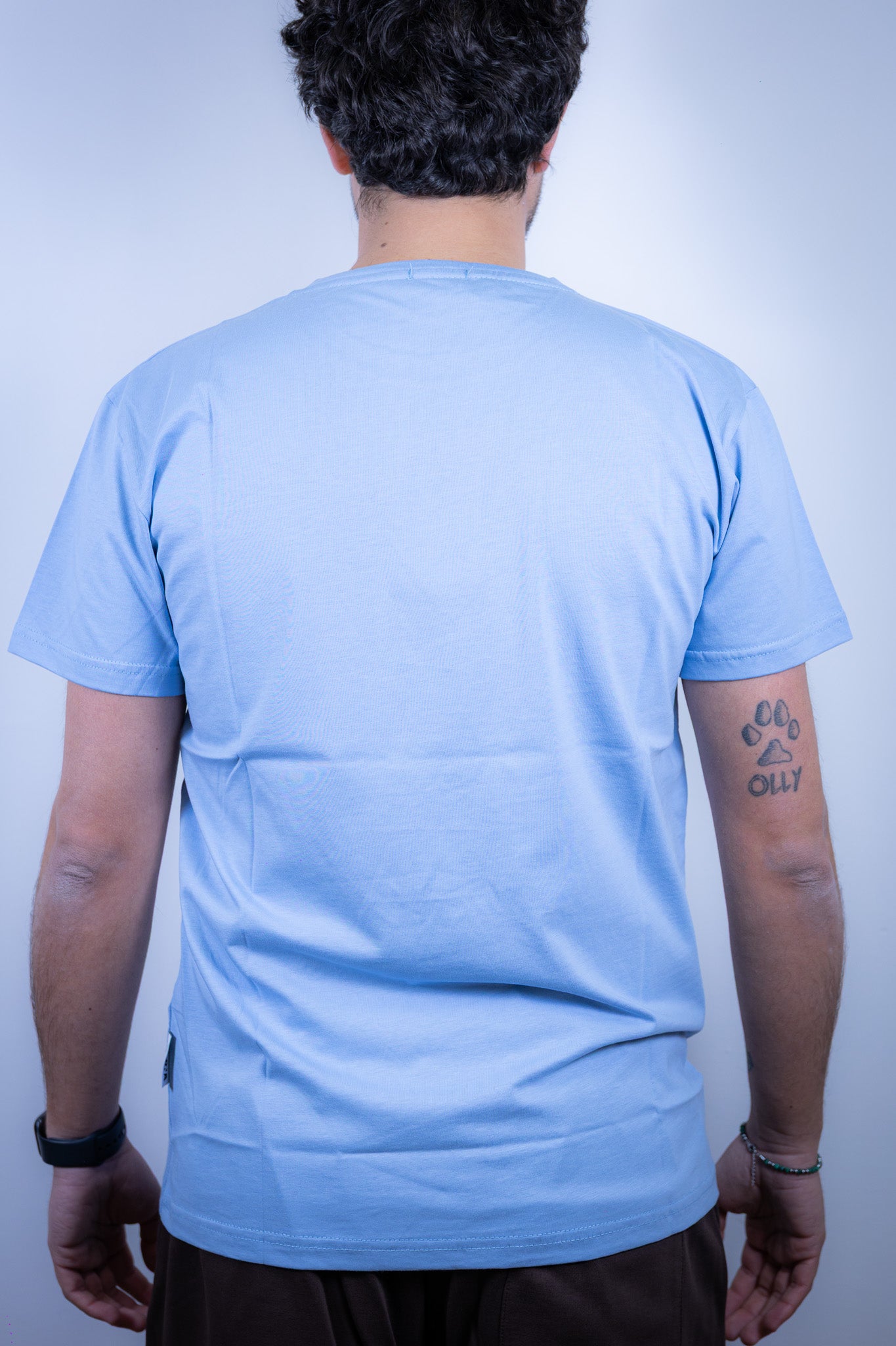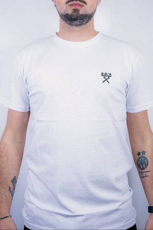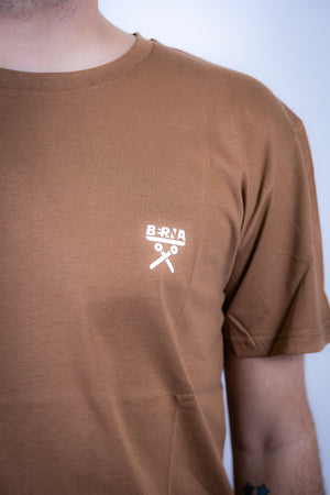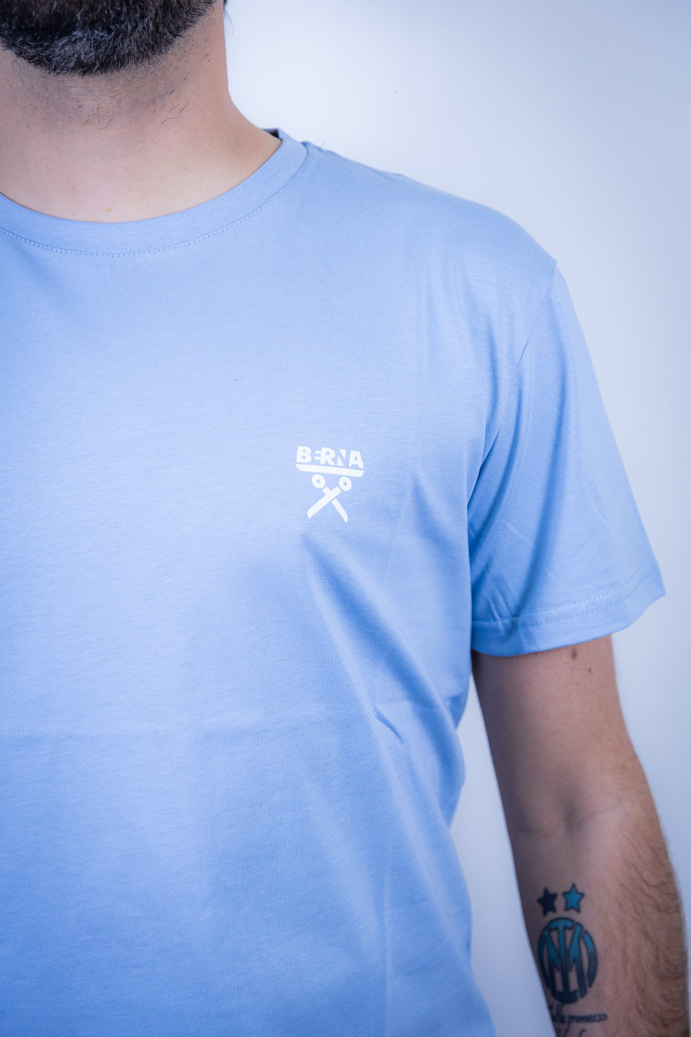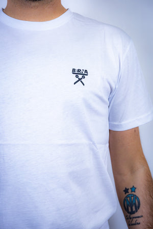 T-shirt girocollo berna in puro cotone con logo stampato lato cuore, fondo dritto con bandierina logo applicata lateralmente.