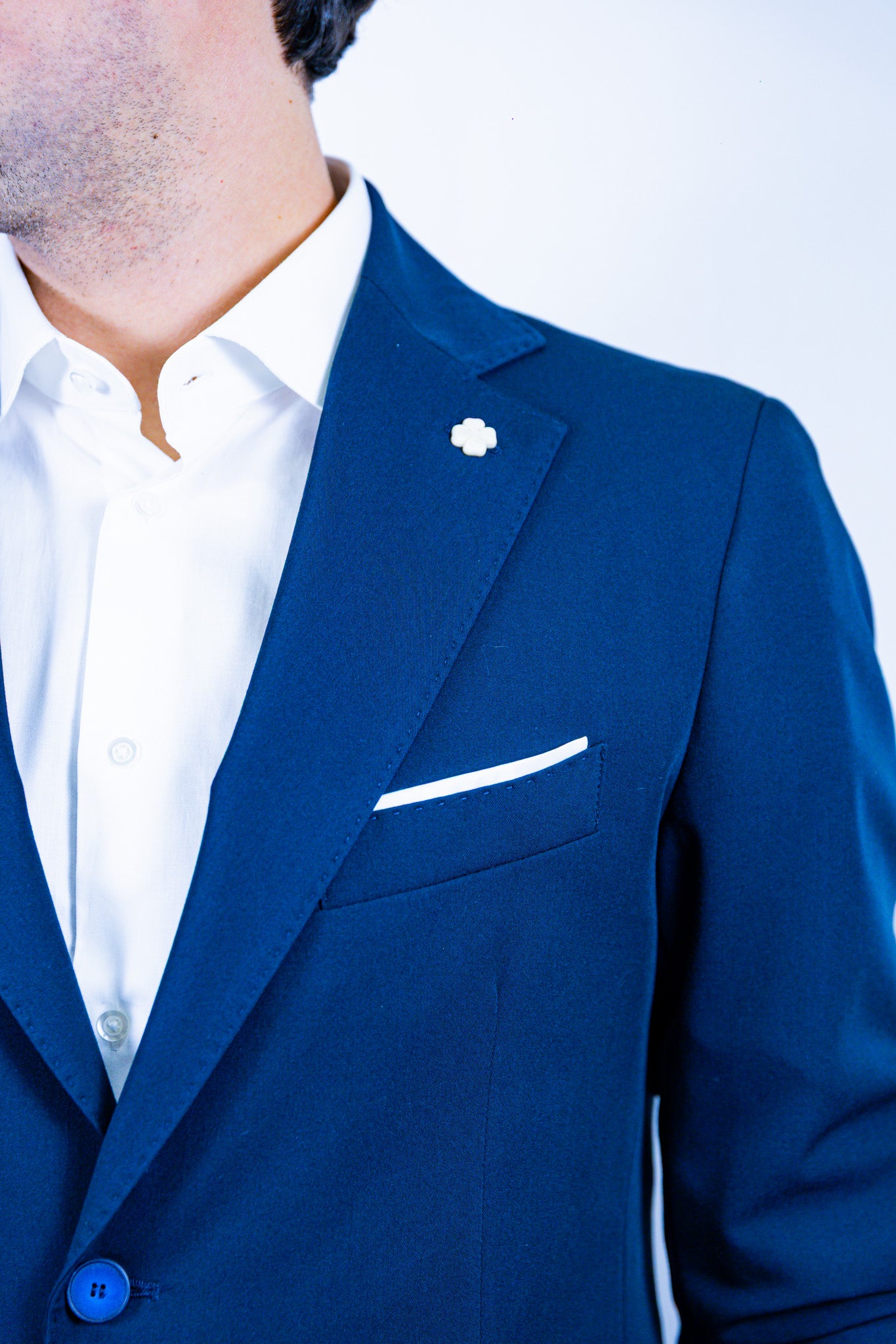 Abito monopetto over-d 2 bottoni con tasche a filetto, doppio spacco sul retro della giacca e pantalone sartoriale.
