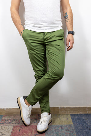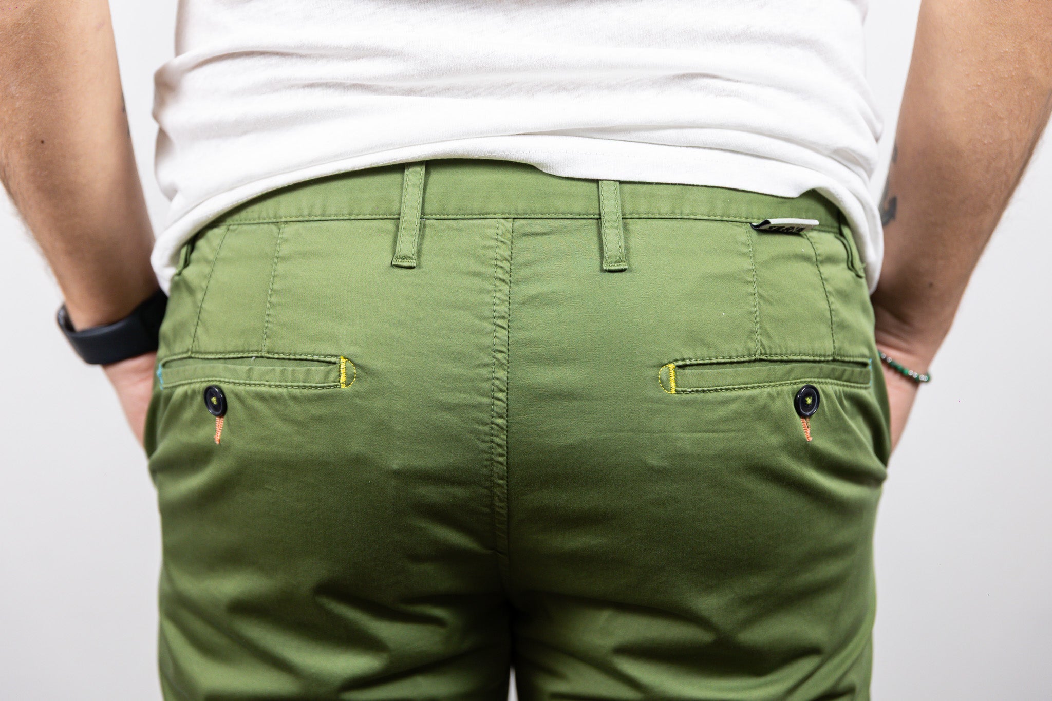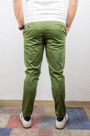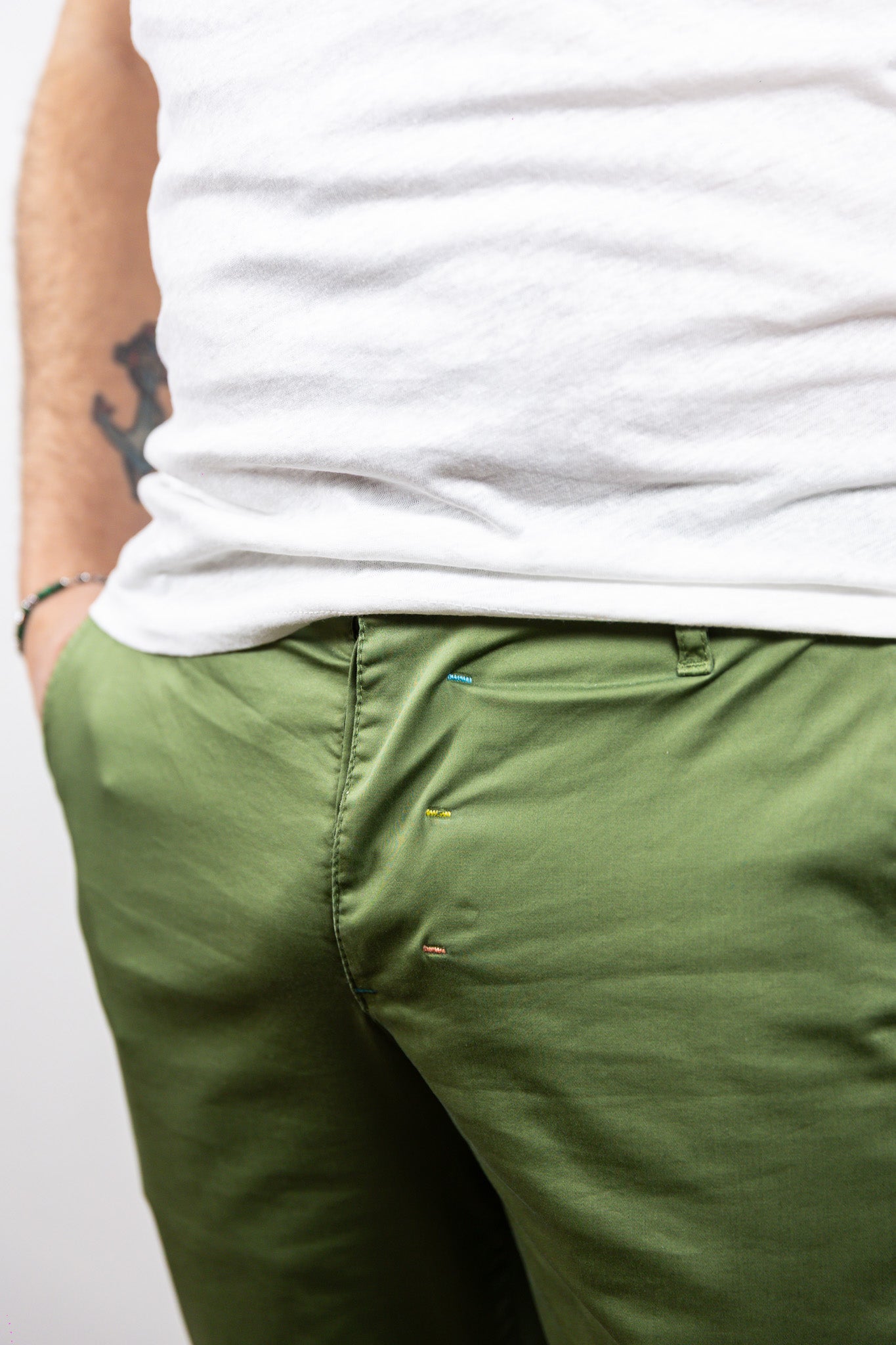 Pantalone chinos color verde modello Wembley berna in misto raso cotone, chiusura centrale con bottoni con cuciture colorate e placchetta logo applicata sul fronte.