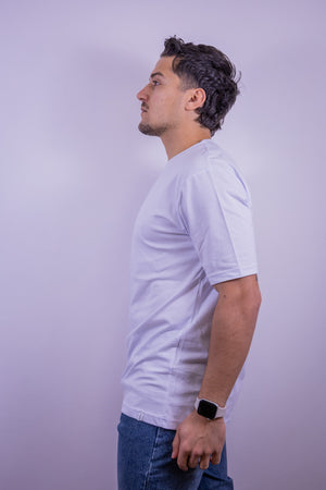 T-shirt paricollo bianca over-d con logo piccolo applicato sul lato della maglia.