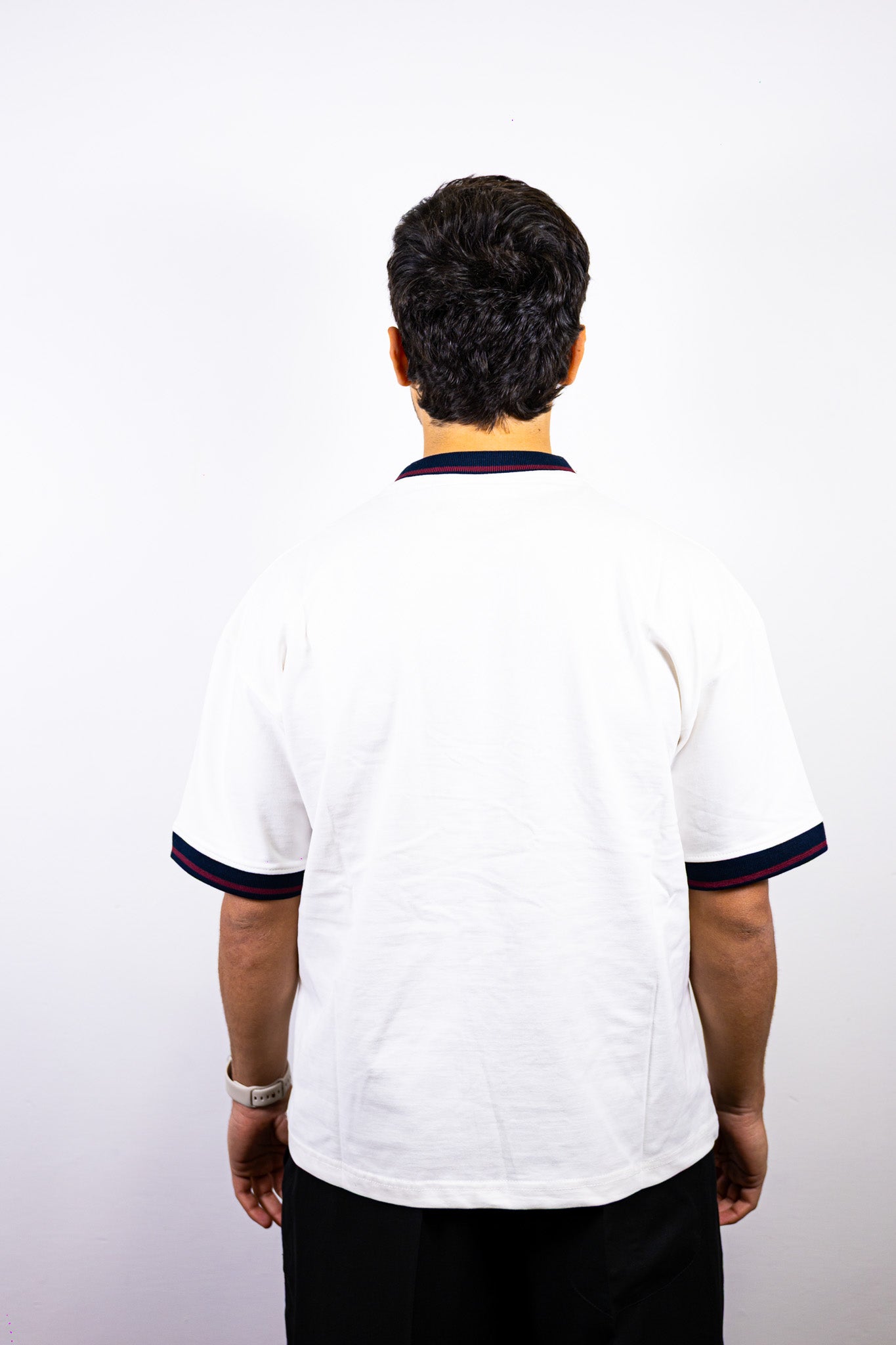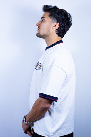 T-shirt bianca in cotone 270g/m² prohibited con ricamo PMCO lato cuore, con dettaglio a contrasto su collo e maniche.